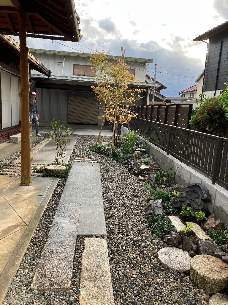 初めは中庭部分はすべて砂利にする予定でしたが、お客様から追加依頼で既存の延べ石を上手に使って、玄関からガレージまでのアプローチの作製と植木を少し植えてほしいとのことでした。
