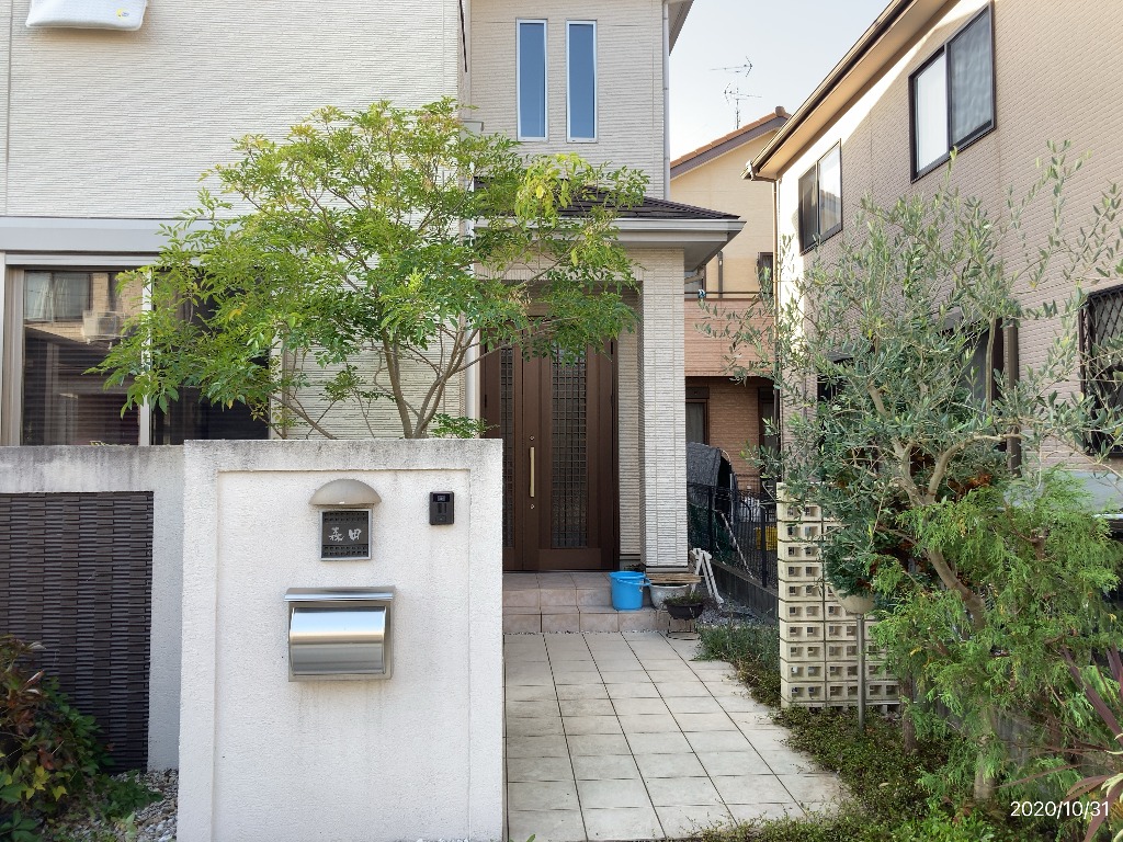 さてさて。今回レポート対象となる東近江市K様邸ですが、玄関前に少しの植栽スペースがあり、少し奥には中庭があり沢山木が植わっています。さらに奥には裏から入れる駐車場と古いカーポートがあるといった構造となっています。
